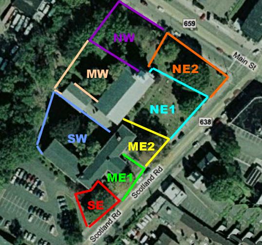 the Old Burying Ground The mapping project of the Old Burying Ground began on 03/18/08. Mr. Robert Reed, historian from the First Presbyterian Church in Orange, NJ, met with me and gave me a tour of the grounds, plus access to the church archive records of grave stone inscriptions, old historical photos, and so on.I divided the Burying Ground into sections, as you see in this modified satellite photo. The Church is in the center of the plot. Mr. Reed explained that the church was built over the remains of settlers, but that their tombstones were moved to the outside areas. Thus, the stones may or may not mark the actual positions of the deceased's remains.I decided to begin mapping and cataloging from the South East Corner, nearest the parking lot, and map another section each time I return to the site over the next few months. |
